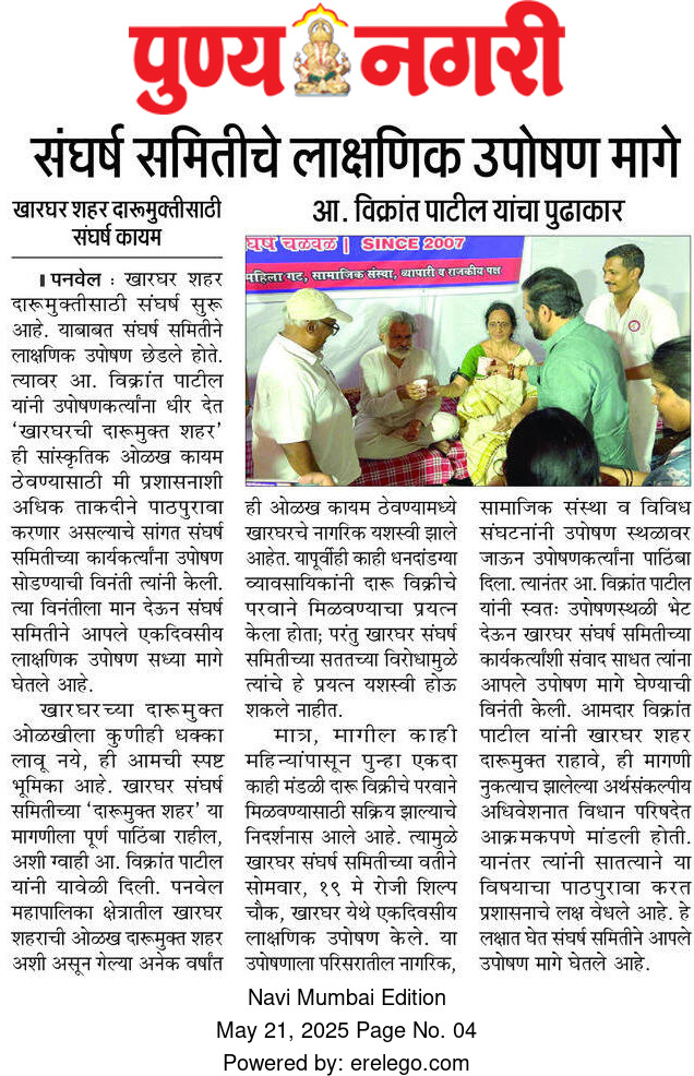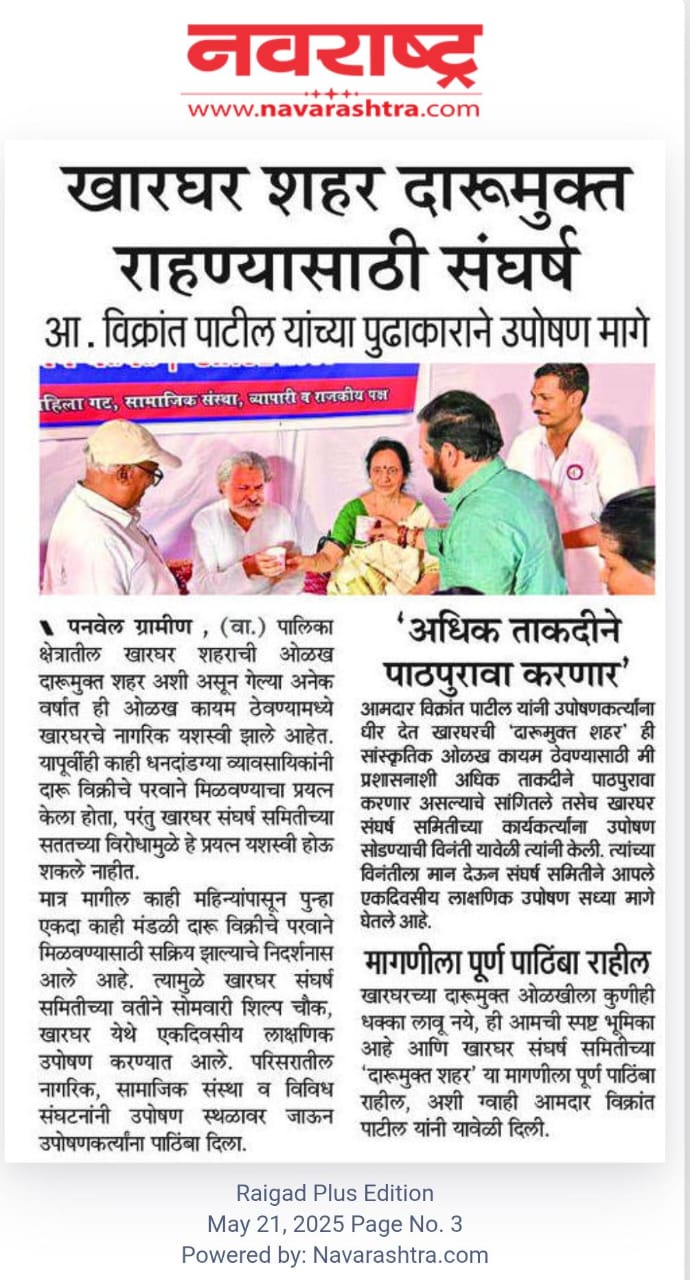 MLA Vikrant Patil’s sensitive yet firm approach in defending Kharghar’s cultural and social fabric has offered reassurance to the public. An alcohol-free Kharghar is not just a demand—it is a pledge for a brighter future for the next generation. Vikrant Patil’s fight to fulfill this pledge will continue unwaveringly.